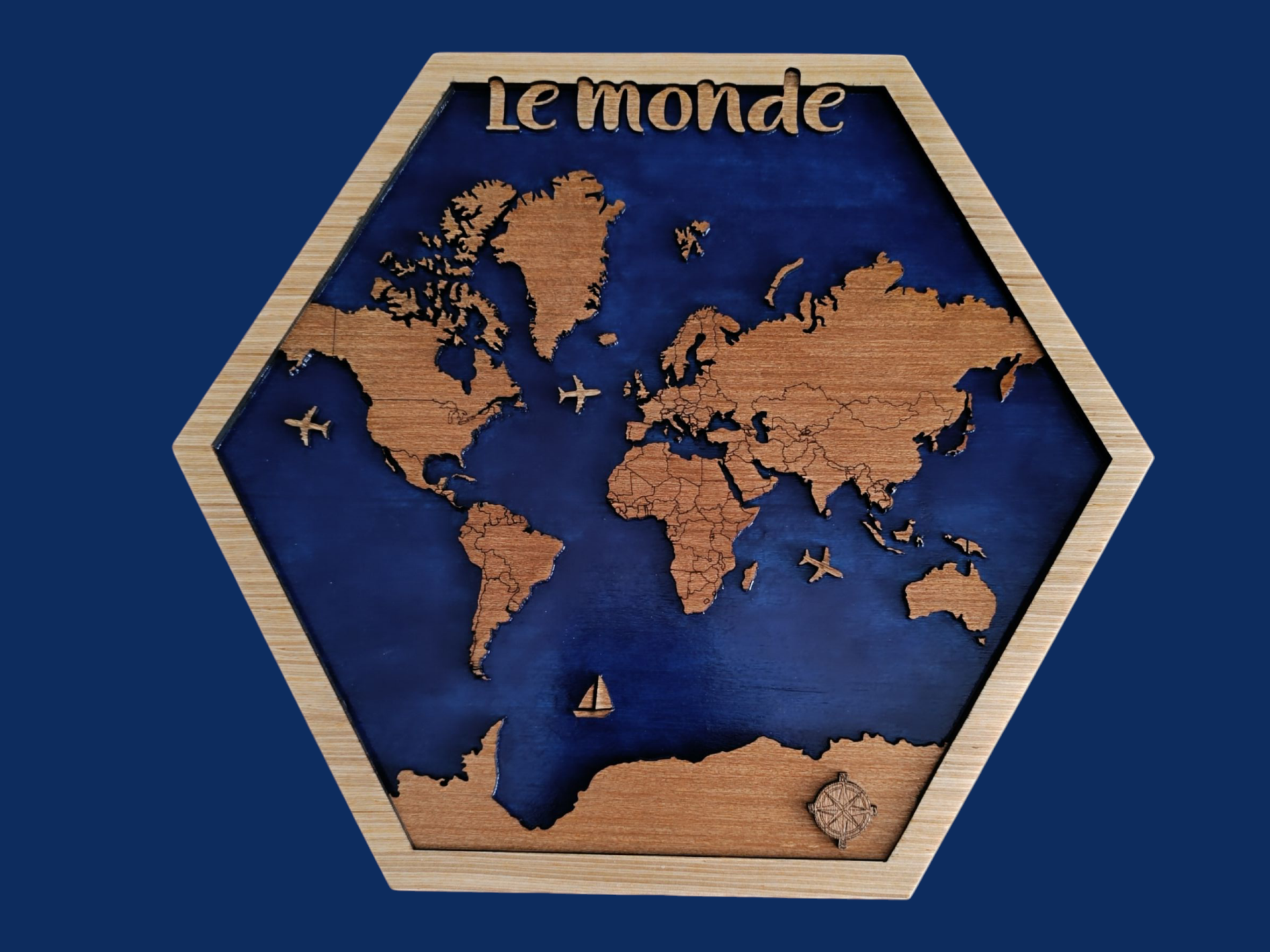 🌍 Cartographie murale en bois – Hexagone – Le Monde