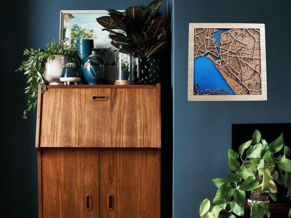Offrez-vous un morceau de la Vendée avec cette cartographie murale en bois représentant Saint Gilles Croix de Vie, station balnéaire emblématique de la côte Atlantique.